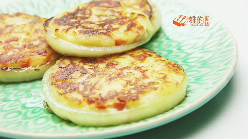 6:平底锅放点油,先放洋葱圈,再把搅拌均匀的土豆泥放入洋葱圈中,小火煎翻面煎到两面金黄。开动~