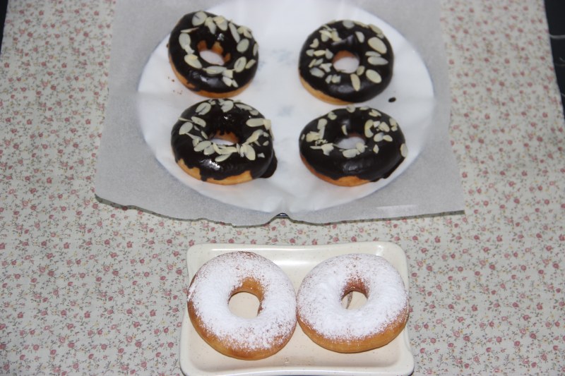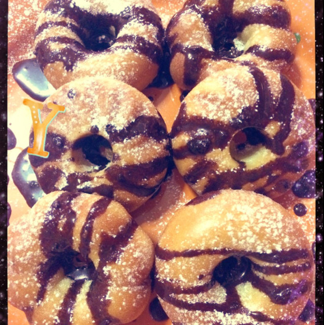 9:巧克力隔水融化,涂在甜甜圈上,撒上奥利奥碎或者巧克力针(推荐白巧克力,比较香甜)