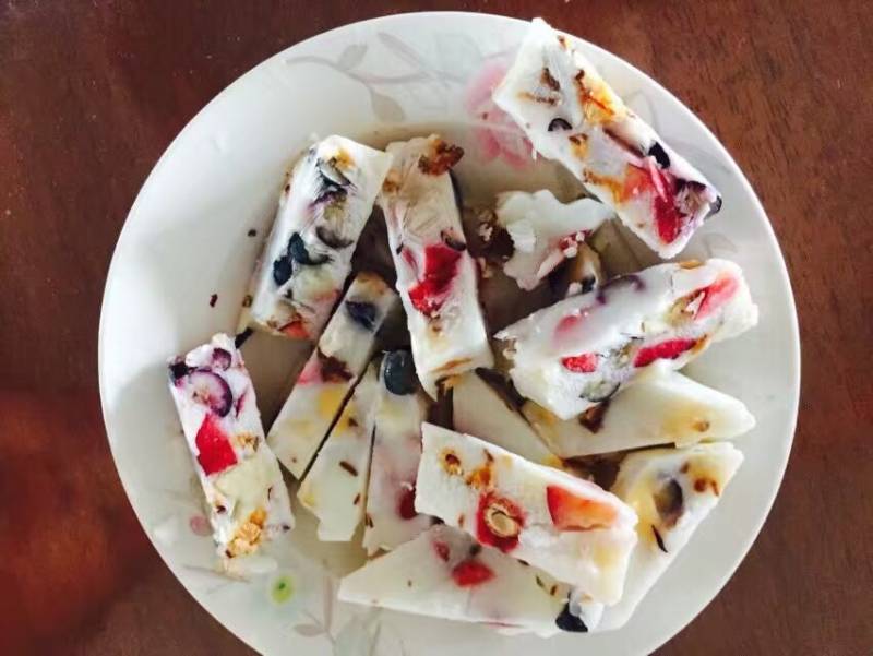 9:因为是软膜,所以很快就容易脱模了,之后,摆盘,一碗“酸奶水果棒棒冰”就做好了。