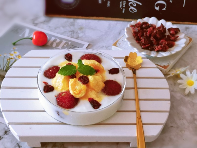蔓越莓果干10克;薄荷叶1朵;杨梅4颗;