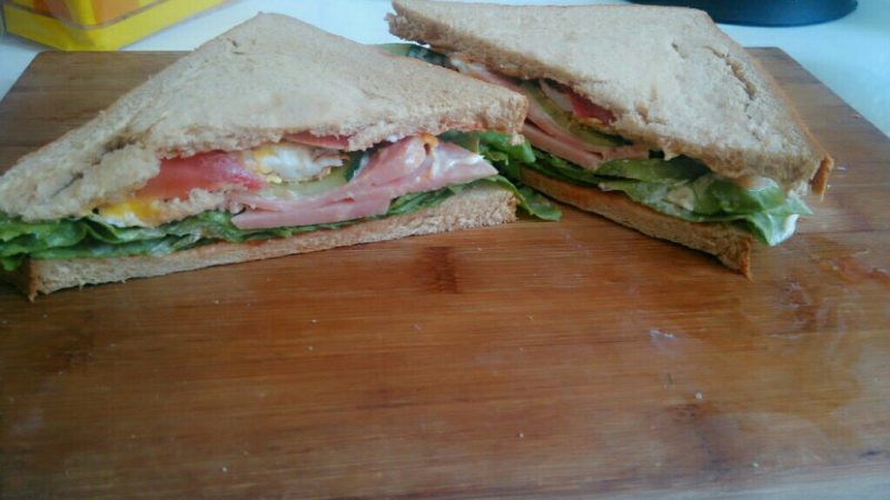 全麦面包片2个;火腿1段;西红柿1/5个;黄瓜1/4个;生菜叶2个;鸡蛋1个;