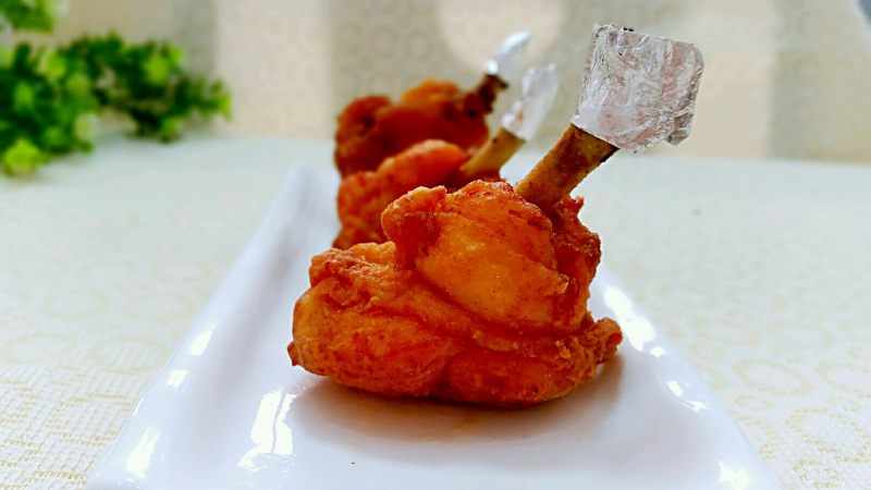 7:锅中多放些油,油烧热后下入裹好粉的鸡腿,高温定型转中小火炸熟即可
