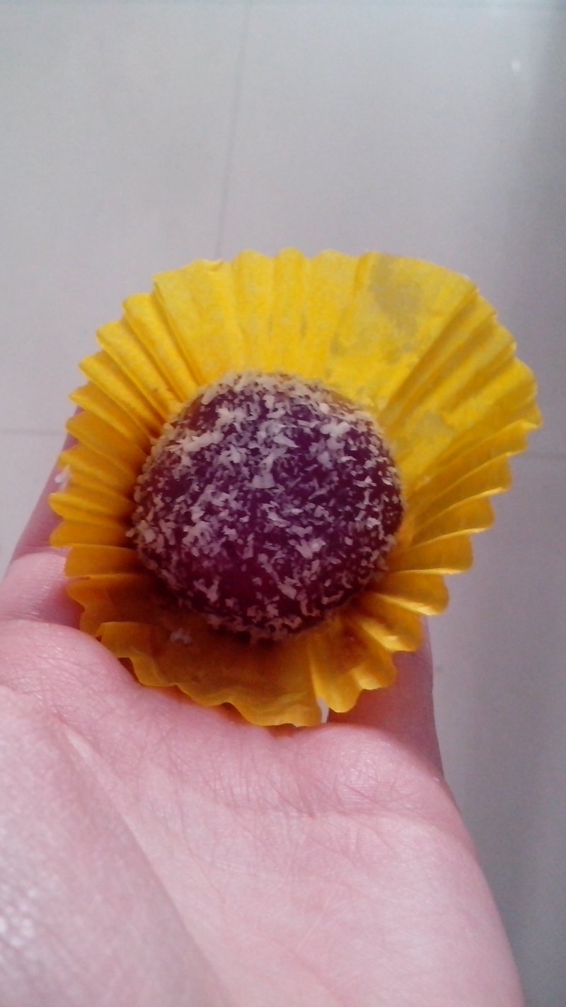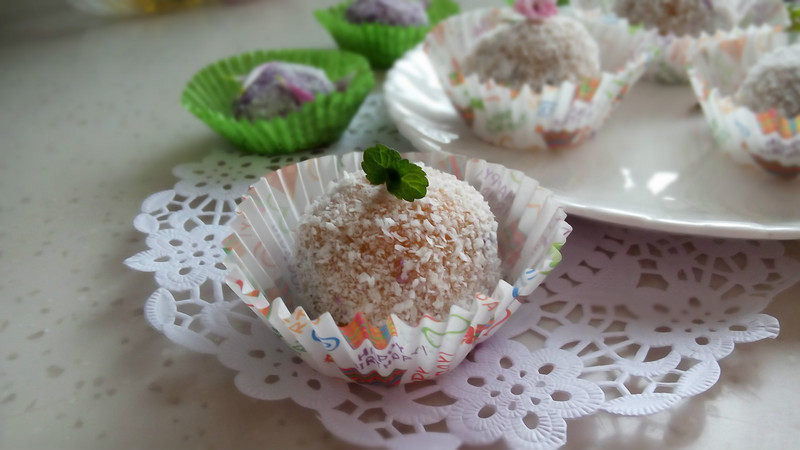 8:在丸子上刷少量蜂蜜,然后在椰蓉里滚一圈,装在好看的纸托里就好啦!椰蓉我是在淘宝店铺里买的,纸托也是淘宝。