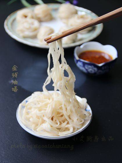 23:蒸好的金线油塔用手或者用筷子拍打蓬松。油塔变成一根根的,蘸着蘸汁就可以吃了。