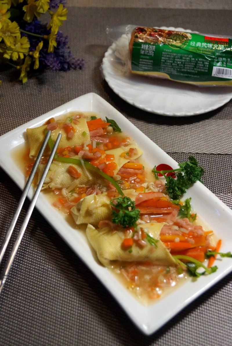 厚百叶一张;荷美尔火腿适量;芹菜适量;金针菇适量;胡萝卜适量;