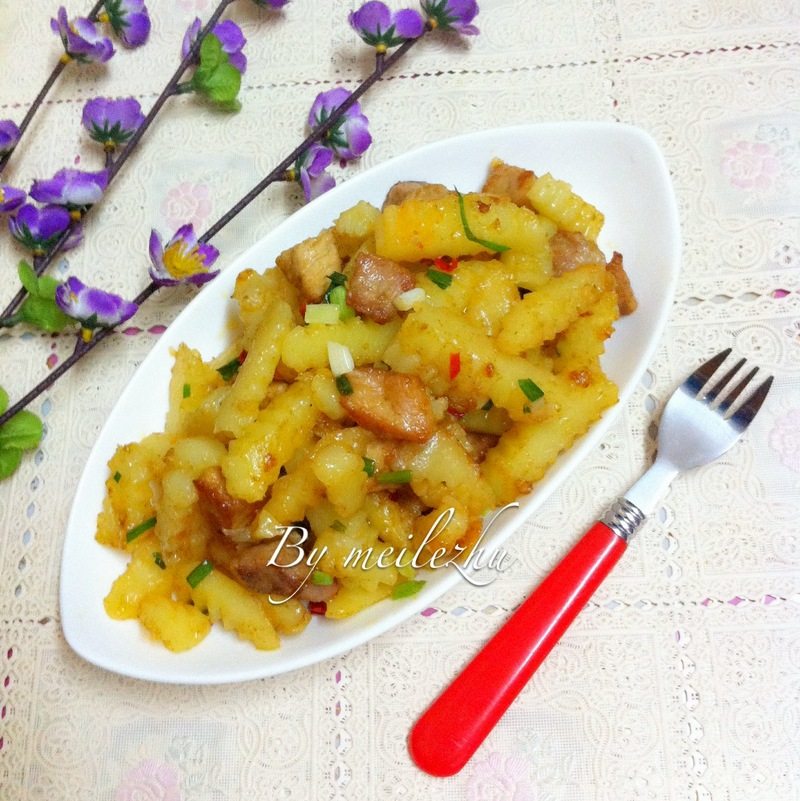4:煎锅倒油烧热,放入土豆煎至两面微黄,撒上所有调料翻炒均匀。