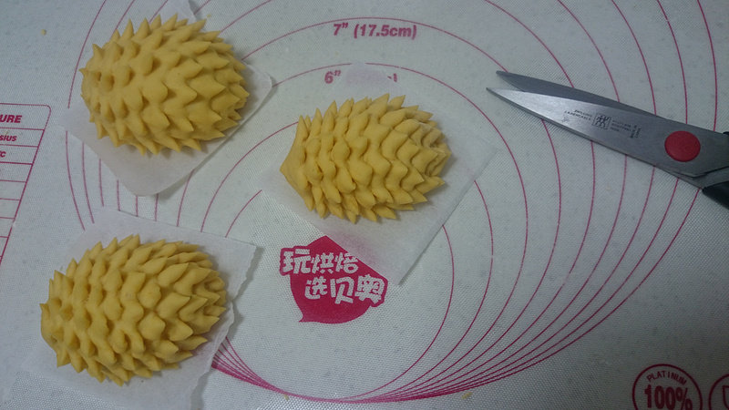 11:把小面团搓成水滴状,用剪刀一层层剪出层次,像刺猬一样