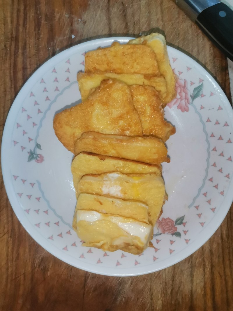5:因为馒头本身就是熟的,所以下锅看蛋液凝固就可以翻面了大概一面20秒就可以。