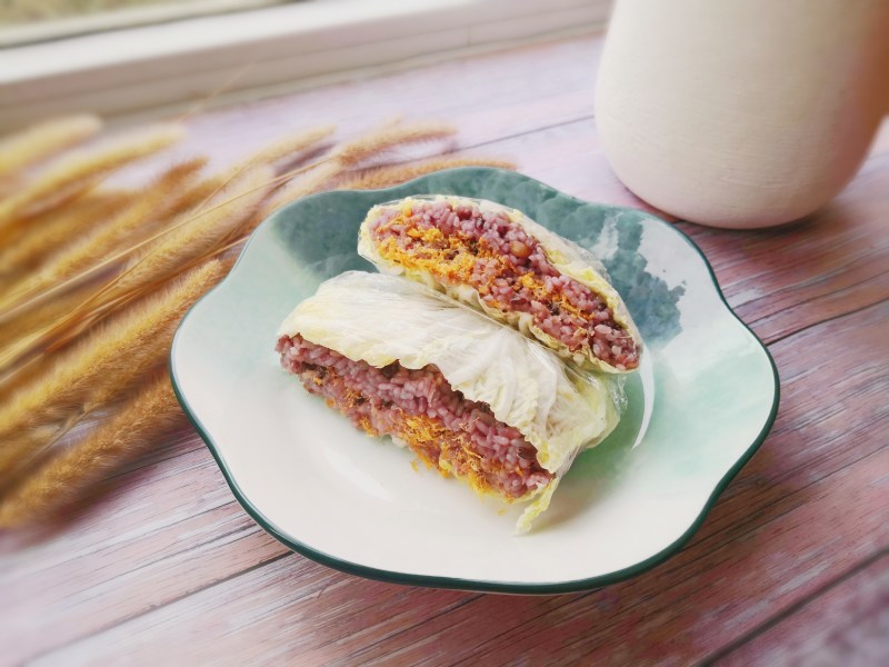 4:白菜叶清洗干净,这个时候的白菜很甜很好吃,选择白菜里面的嫩叶,一片白菜叶挤上适量的沙拉酱,再来一大勺杂粮饭,中间放上适量。
