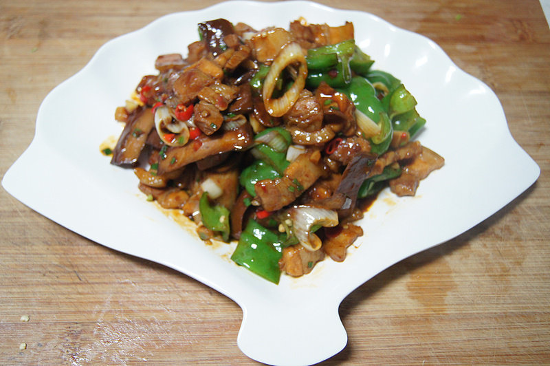 10:开锅盖,下入大葱葱白和青椒片,转大火颠锅翻炒,此时要多翻炒几次,顺带收汁。