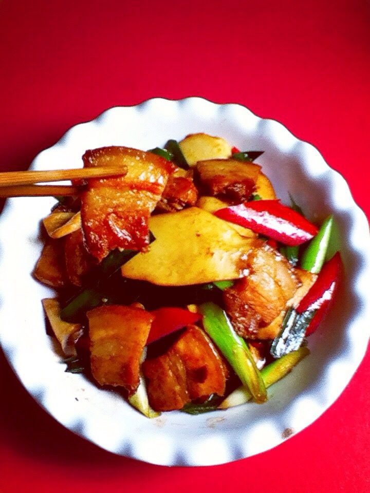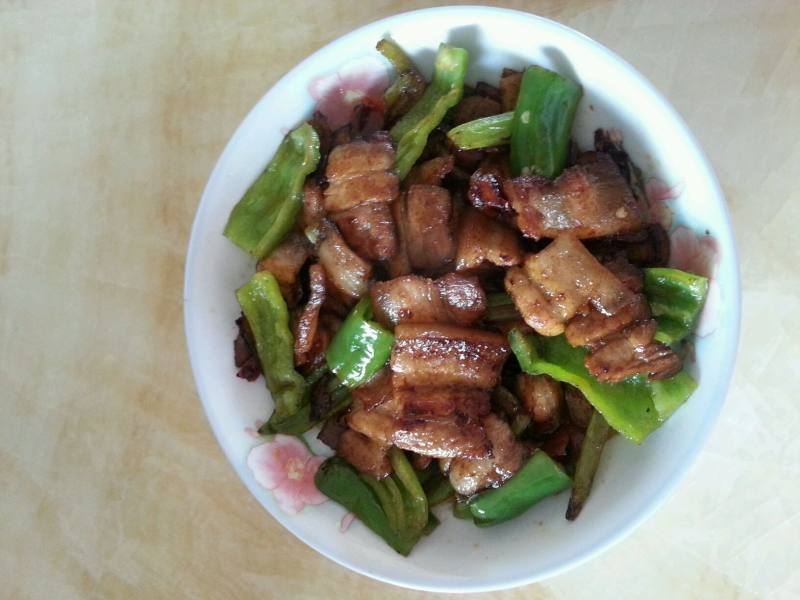 6:锅中留油放郫县豆瓣炒香,放入五花肉,青蒜,糖,料酒炒熟即可。