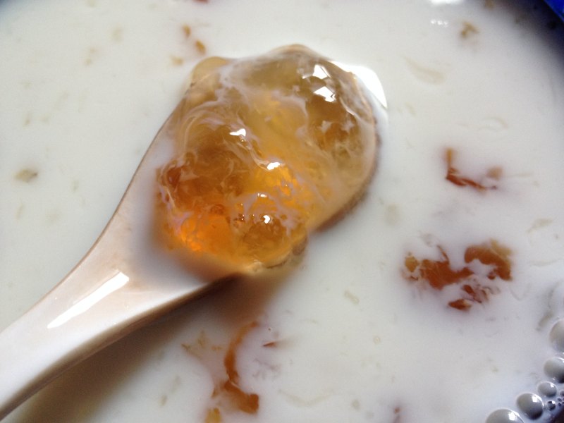 1:桃胶半碗水冰糖放入炖盅炖45分钟取出待用(没有炖盅的,也可放在锅里煮,但水的比例要多,避免粘锅底)