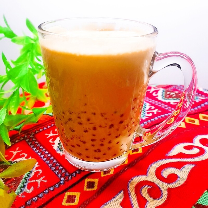 14:熬好的奶茶倒入盛有西米的杯子中。