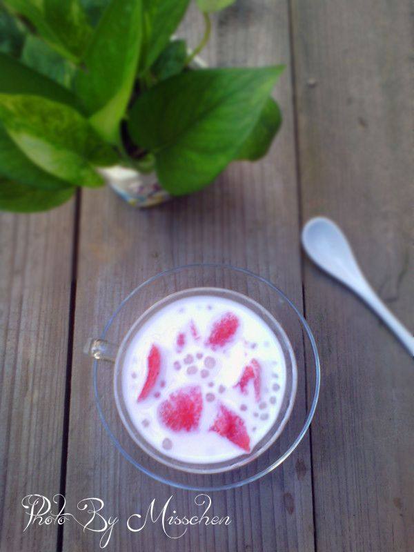 7:再倒入牛奶放上一朵小红花装饰一下,一杯美味可口的西米露就做好了。