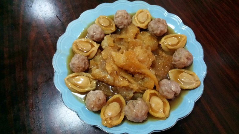 熱水浸好撕片魚鰾兩飯碗;罐頭小鲍魚-罐;肉丸七粒;