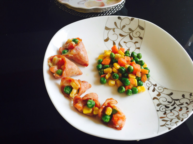 4:然后就是摆样子啦,培根卷成喇叭状,牙签固定,塞入蔬菜丁,上面撒上碎奶酪,最好立着放,放进微波炉叮1min就好啦!