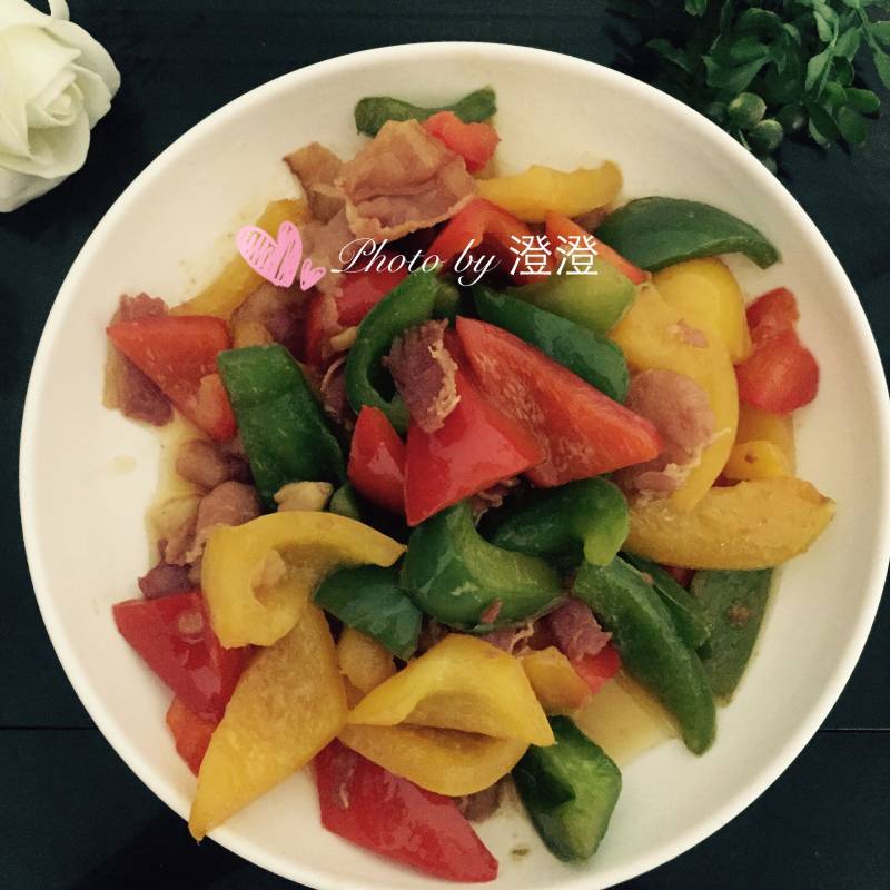 青圆椒半个;红圆椒半个;黄圆椒半个;培根100g;