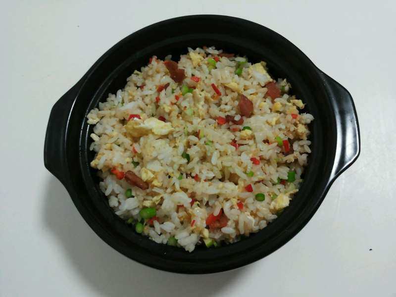 剩大米饭适量;培根适量;鸡蛋适量;红椒适量;蒜薹适量;