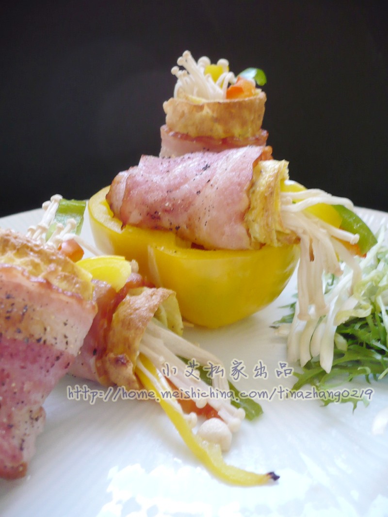 5:铺开一份培根,放上切好的蛋皮,将一小撮金针菇,彩椒放在培根的一头。