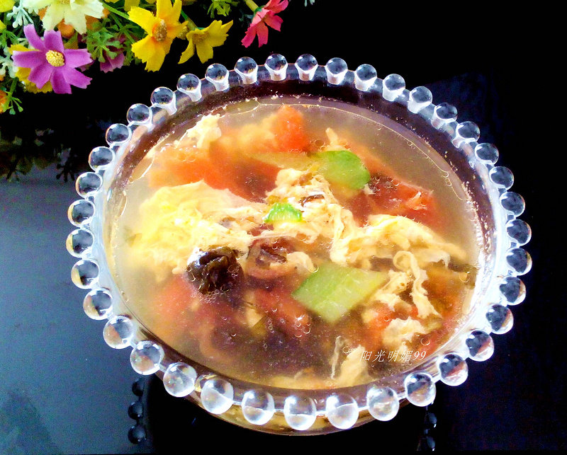 4:水开后,倒入西红柿黄瓜,虾米紫菜。