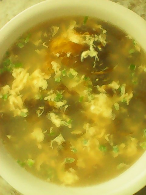 3:紫菜用水泡发,锅里烧好水加入紫菜和少量酒再次烧开,放入油,转小火加入鸡蛋液再次烧开,加点酱油即可