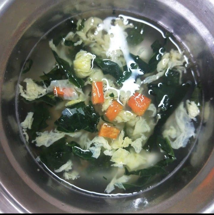 6:放入洗净的地皮菜,淋入鸡蛋液,用勺子搅出蛋花,放入盐,生抽调味即可。