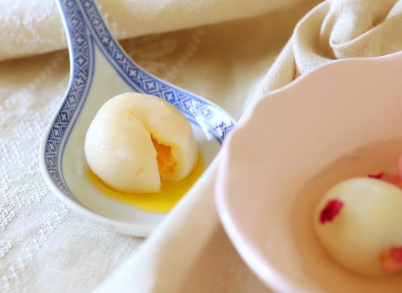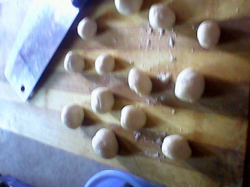 9:冷藏好的咸蛋黄混合物取出来,这时应该是硬硬的,用勺子挖成小球,汤圆的里馅完成。
