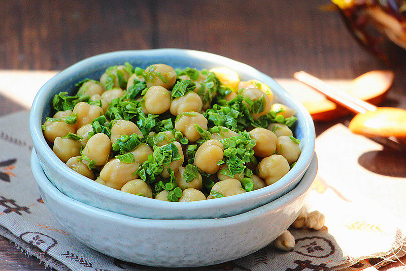 6:煮好的鹰嘴豆和处理好的香椿一起放入碗中,及少许食盐、少许香油拌匀即可。