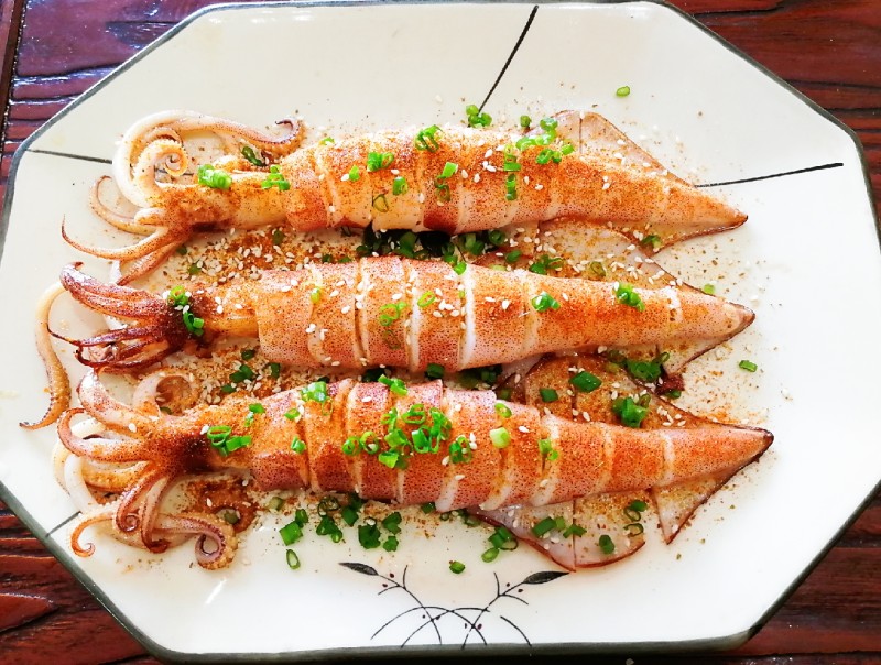 鱿鱼干泡发的时候一定要加一些碱面。烤制时间灵活掌握。