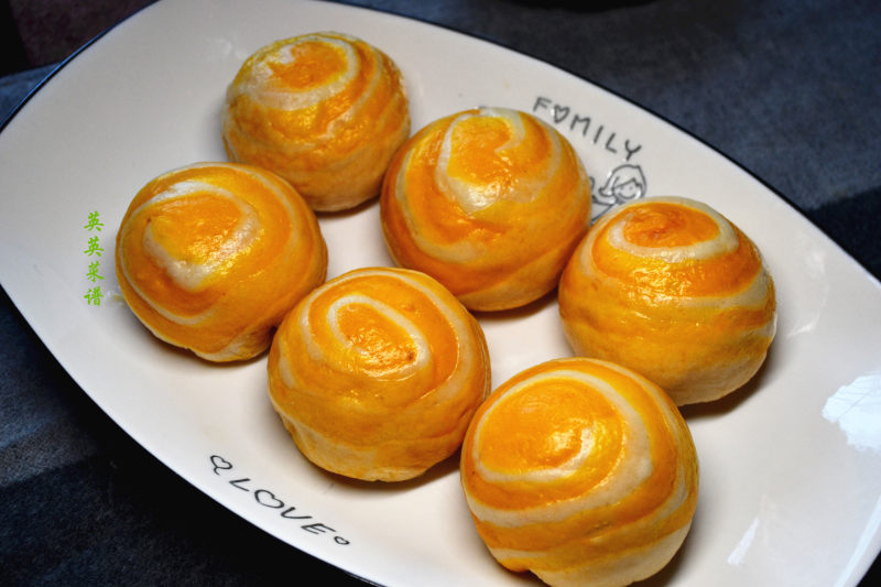 2:面粉加水、酵母、泡打粉和成白面团;南瓜泥和面粉。酵母、泡打粉和成南瓜面团。放置温暖处饧发。