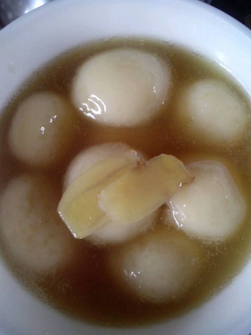 3:等水沸了后,放入切好的生姜片和红糖,同时把搓好的圆子倒入水中,煮十分钟左右就熟了,收火。