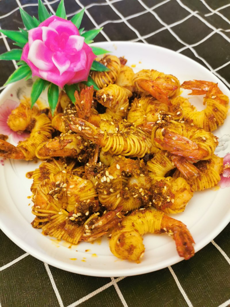 4:然后用面条慢慢的缠绕在虾身上。