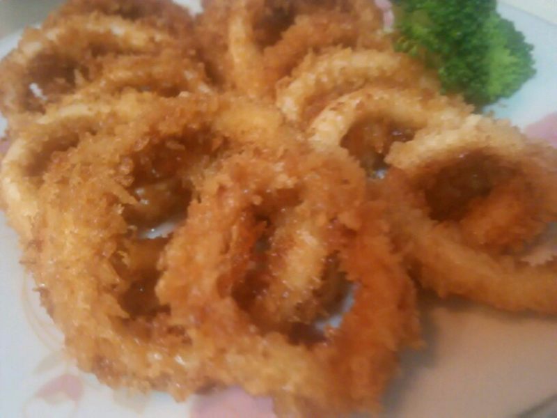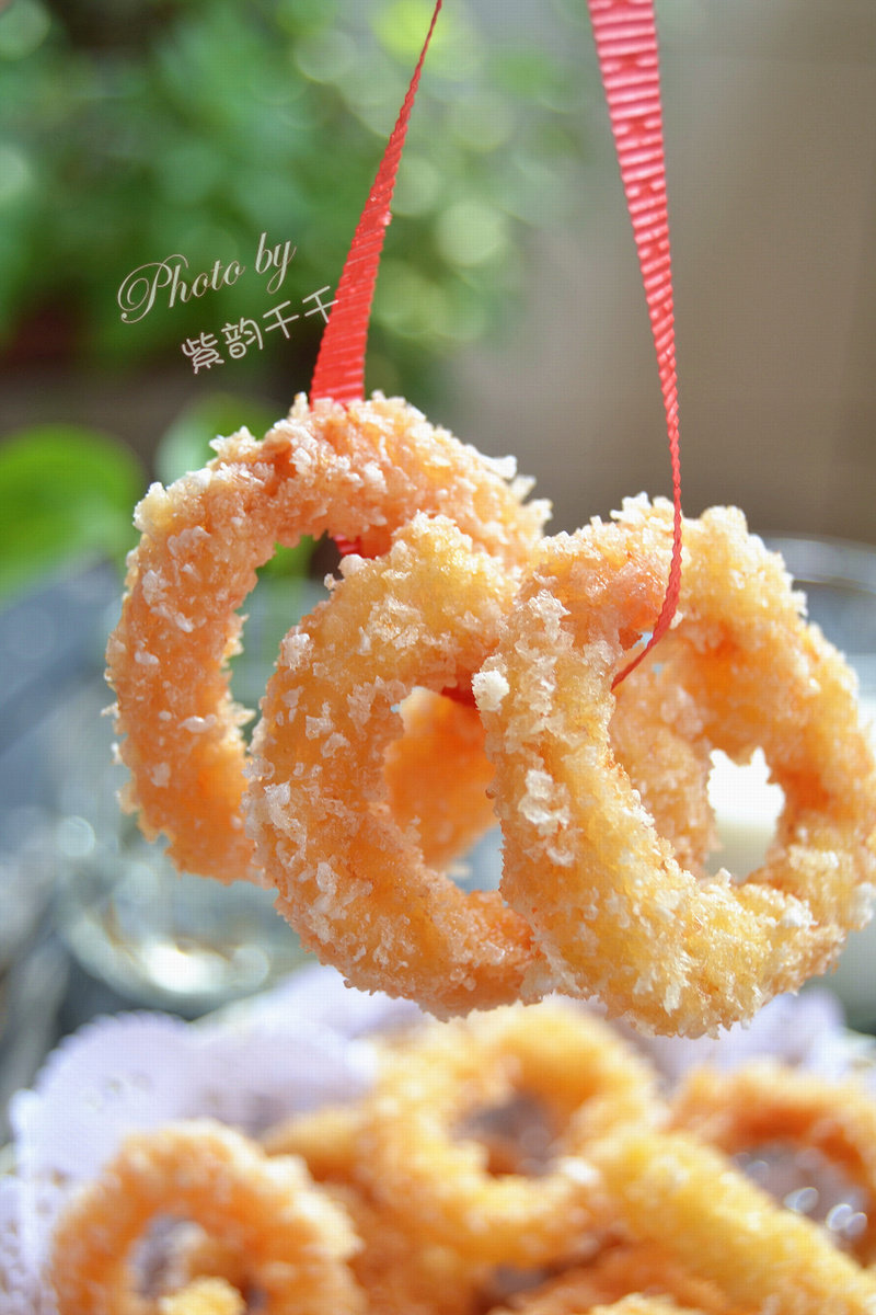 4:油烧至八成热一个个放入鱿鱼圈,中小火炸至金黄色