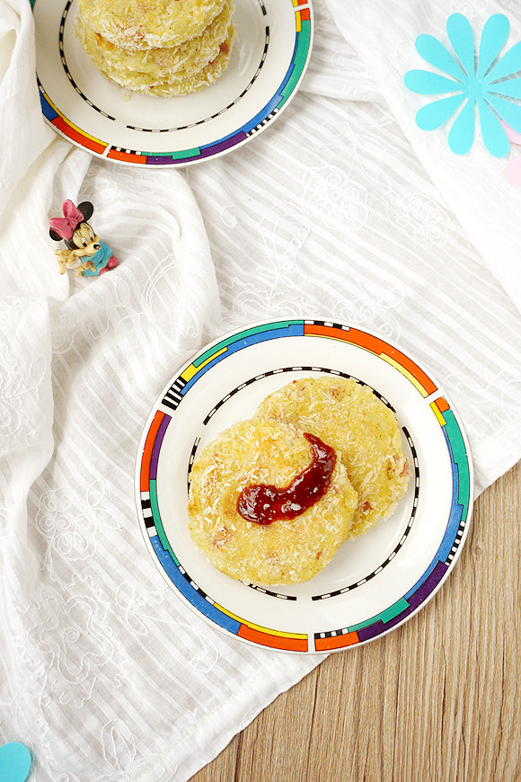 10:电饼铛预热,倒浅浅一层油,放入裹好面包糠的土豆饼。