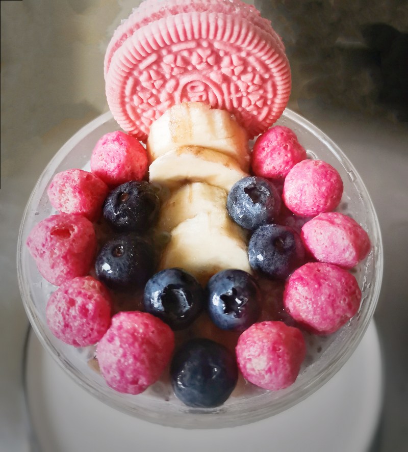 香蕉1根;兰香子1匙;谷物早餐10颗;奥利奥饼干1块;