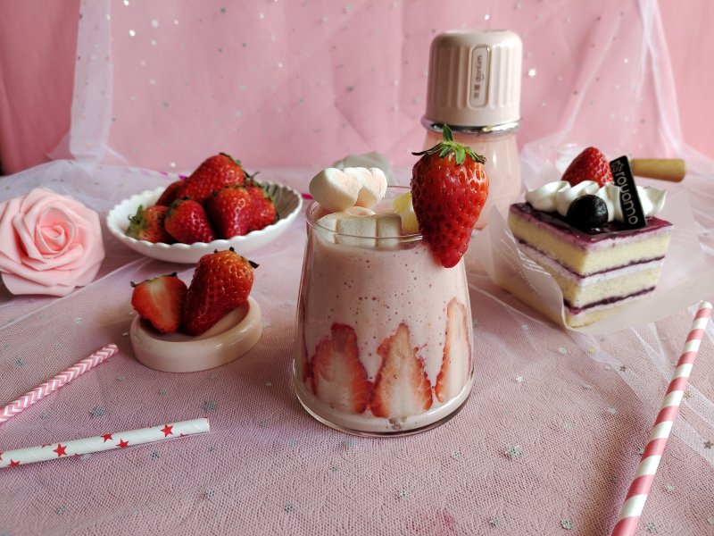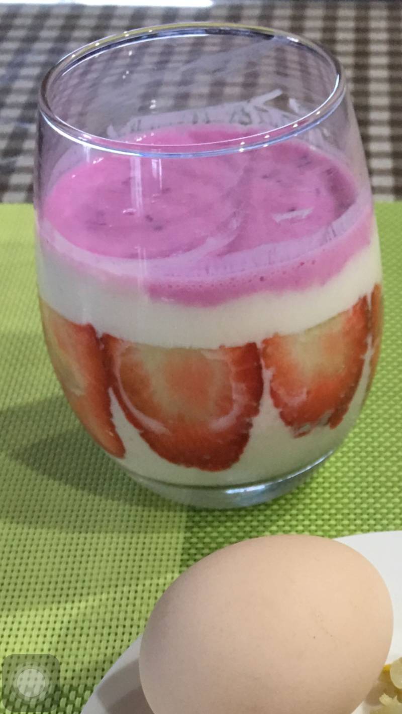 用料理机打完的酸奶昔会有气泡,略微沉淀一下,可以将气泡减少;草莓片不要太厚,用手指轻轻按压,使草莓汁出来一些,更能服贴在杯壁上。