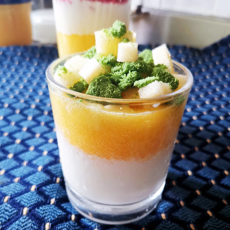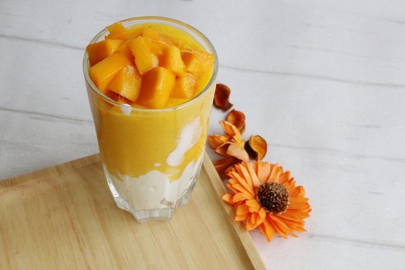 5:将适量的自制酸奶入料理杯中,再倒入芒果肉