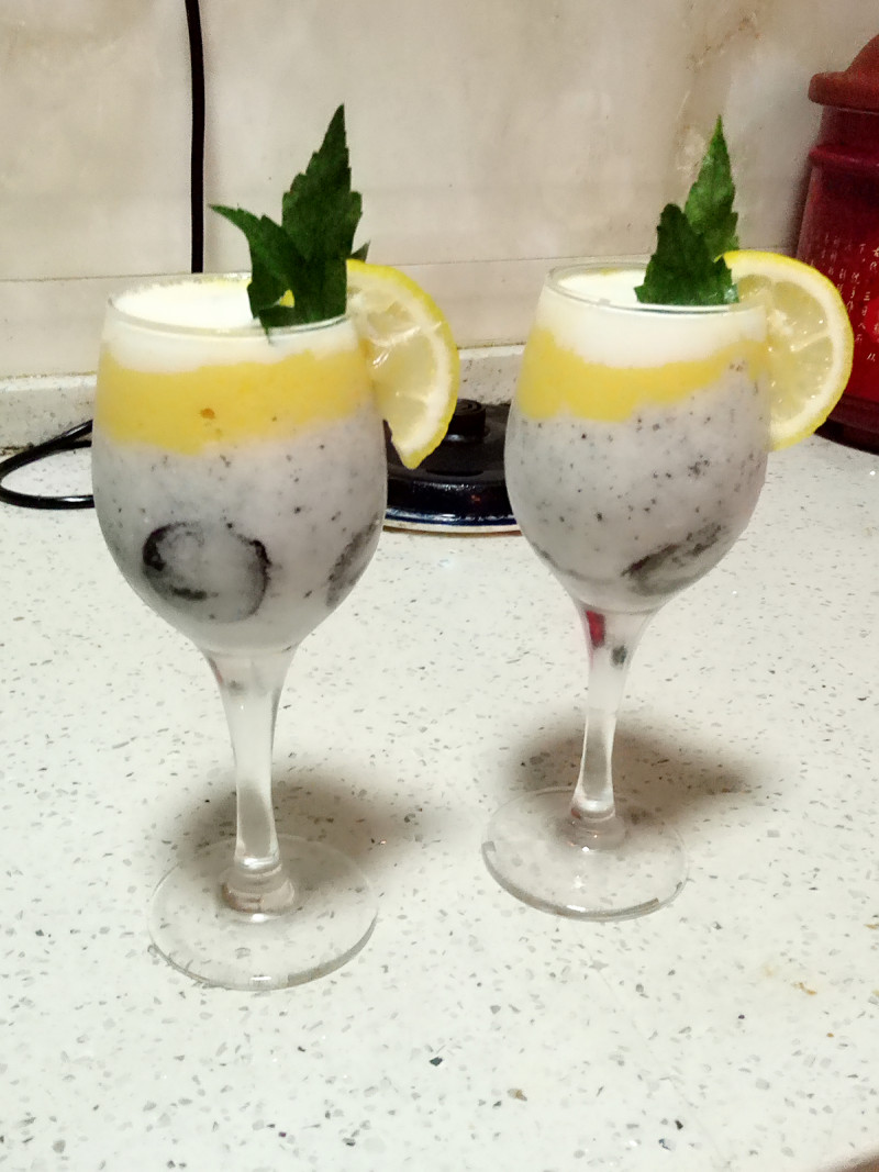 1:备料火龙果加 酸奶用搅拌机打碎芒果 酸奶用搅拌机打碎杯子底下垫四片切半的葡萄打碎的火龙果液用小勺子舀进去,就这么突然倒进去下面的葡萄容易飘起来,想要更有层次就在倒入的火龙果液上用小勺子铺一层酸奶,接着还是用小勺子一点点倒入搅碎的芒果液,最上面还是铺一层酸奶,最后柠檬片和叶子点缀。完毕。