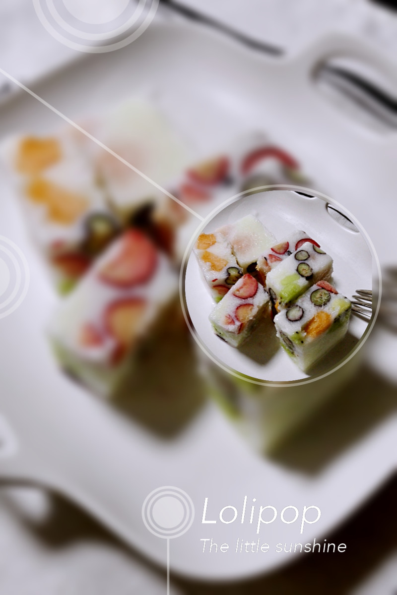 4:可以切块食用。清凉,口感酸甜,我放的时令水果蓝莓,猕猴桃,樱桃!