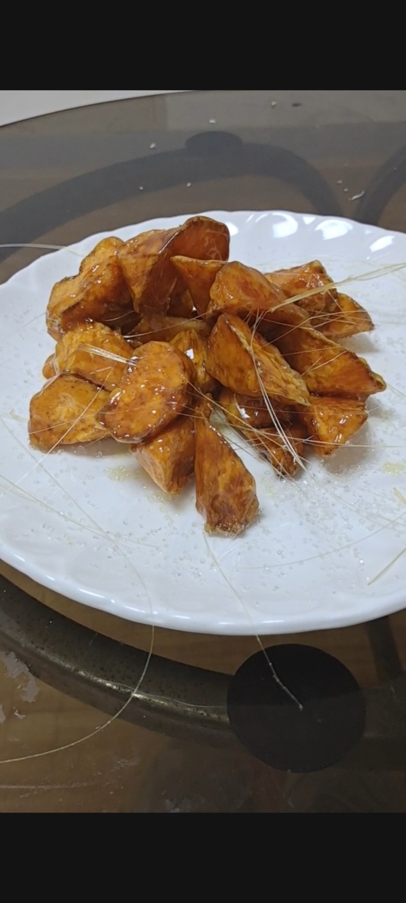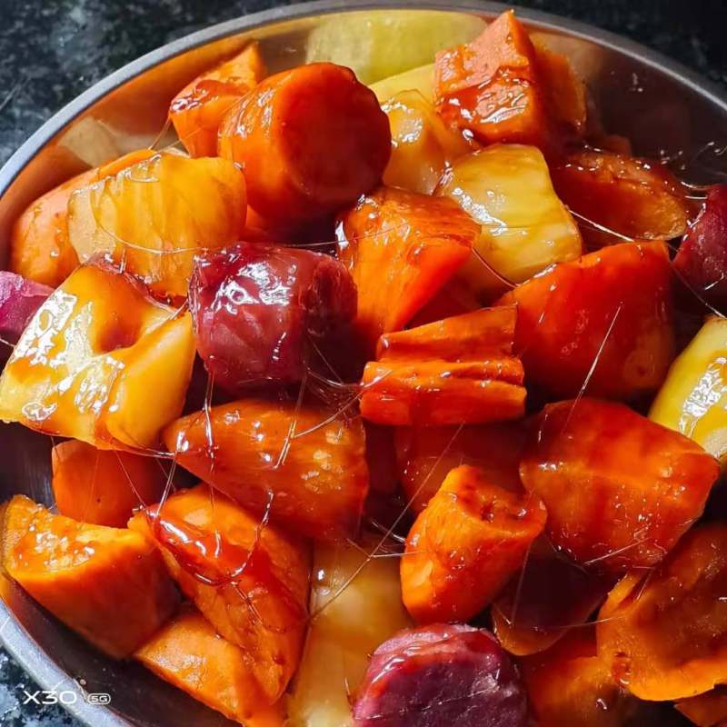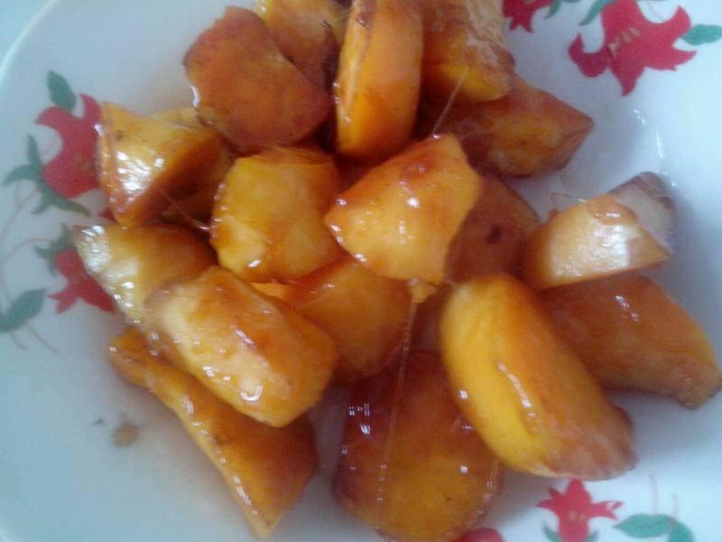 6:锅内留底油,加入适量白砂糖,待糖变色时加入适量食醋,然后将炸好的红薯放入锅内搅拌均匀,盛出即是香甜可口的美味佳肴了!