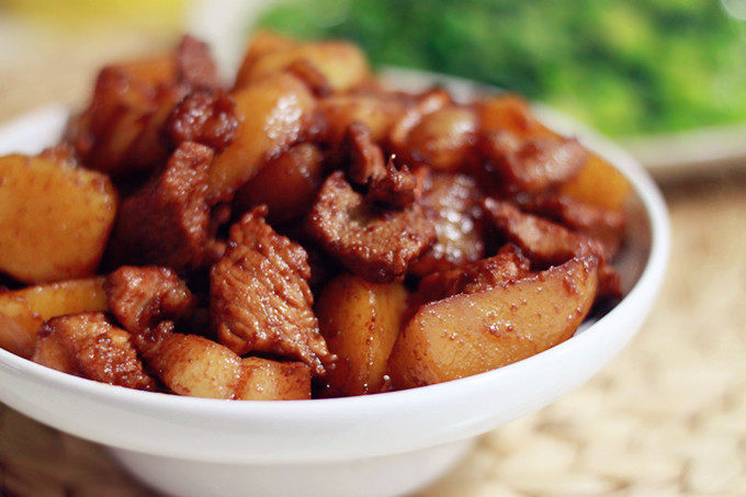 4:倒入瘦肉部份,还有土豆块,翻炒一会儿;