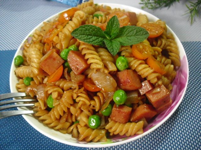 意粉适量;午餐肉适量;青豆适量;洋葱适量;圣女果适量;