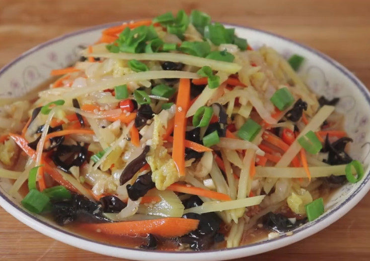 8:白菜挤干多余水分放入盘中,倒入木耳,胡萝卜,土豆,加入凉拌汁搅拌均匀即可,装盘撒上葱花。