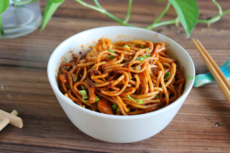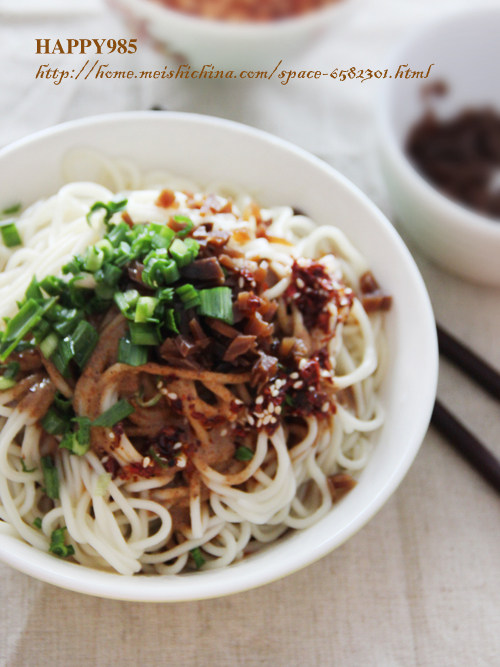 4:淋上之前准备好的两种酱汁,放入葱花、酸豆角、辣萝卜丁、芝麻,油泼辣子。搅拌均匀后就可以开吃了!