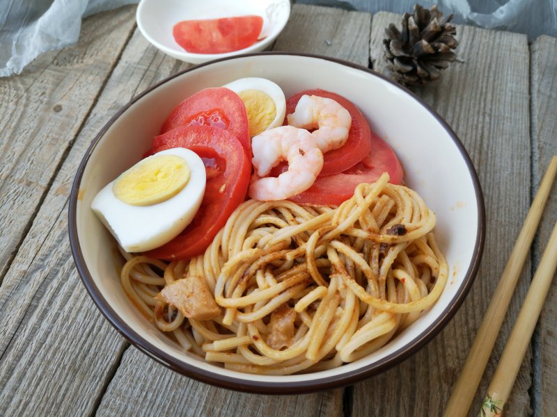 武汉热干面1盒;鸡蛋1个;大虾2只;西红柿半个;