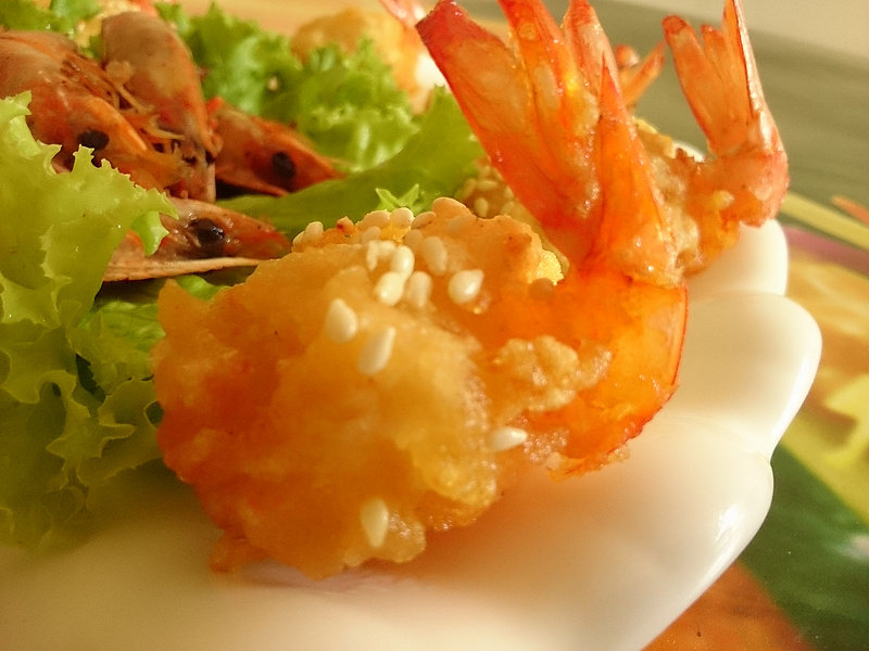 9:锅中油五成热时,将虾尾放入油锅中炸成金黄色捞出