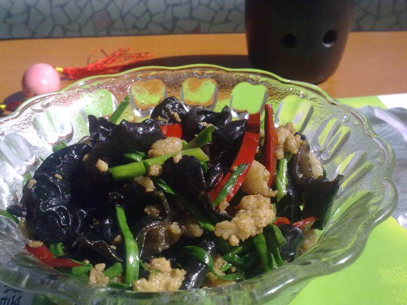 4:锅内放油烧热,加入猪肉末炒散后放入黑木耳、红椒丝翻炒,加盐、鸡精、酱油调味