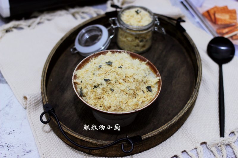 8:晾几分钟,变温后,用勺子舀入海苔肉松。