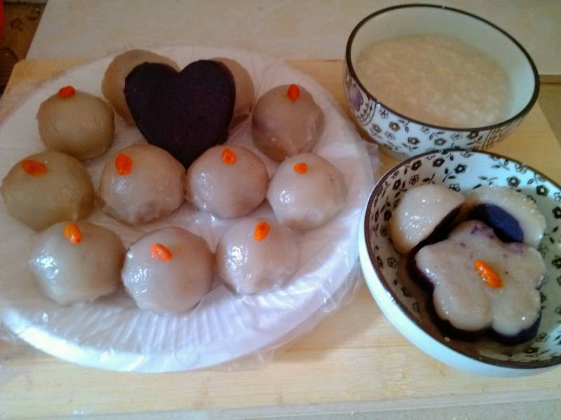 10:其它也一样,包成光滑的圆子。在这一步我把其中一些料用模具做出心形和花朵状的糯米糍,脱模后一起蒸熟。