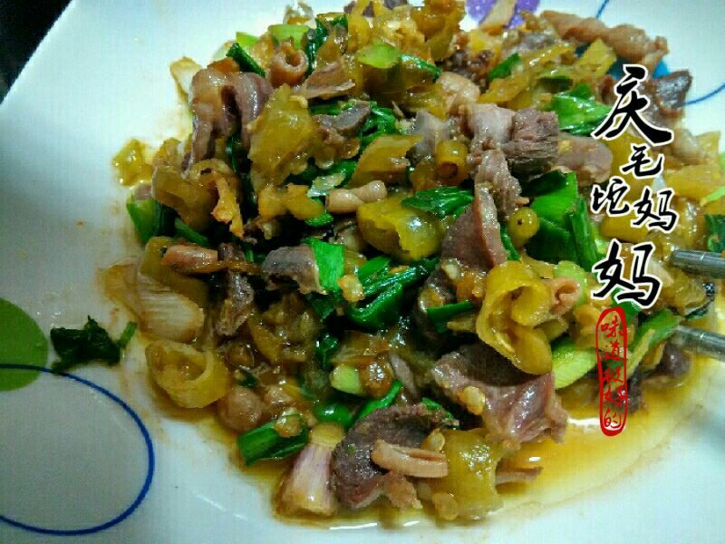 8:再加入鸭胗炒至熟透。